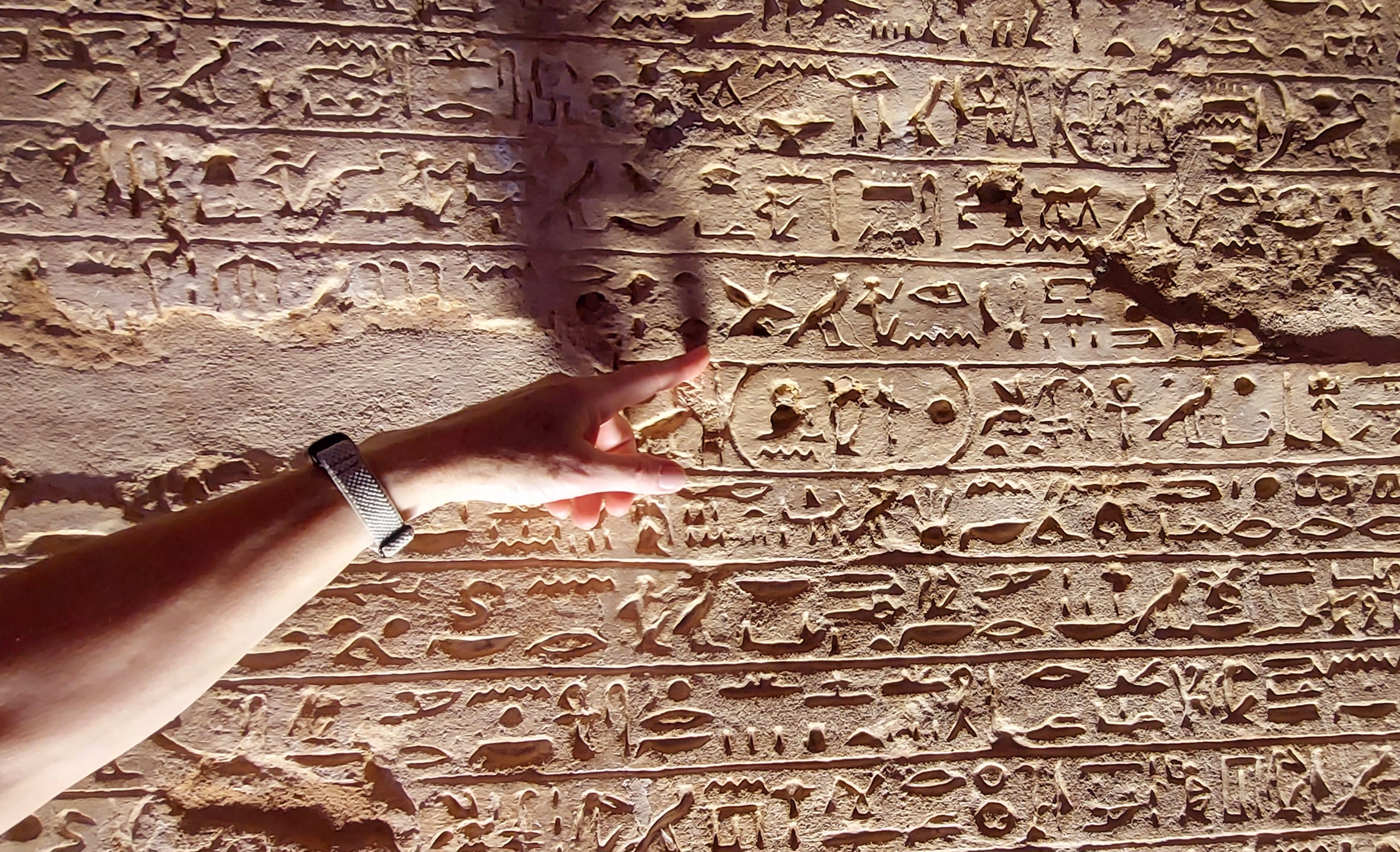 A wall of hieroglyphics, so small, but so detailed (hand to show scale)