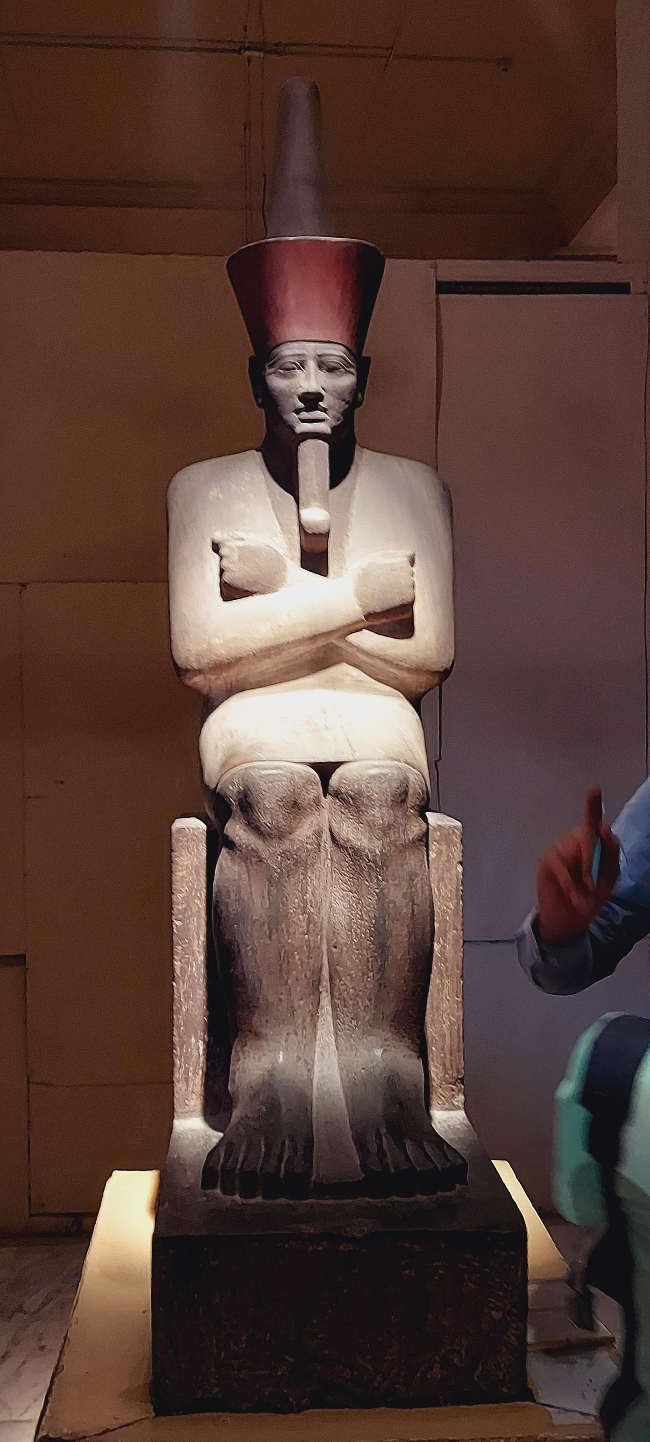 A statue of a dead ruler, depicted by the beard that curls at the end with arms crossed over his chest